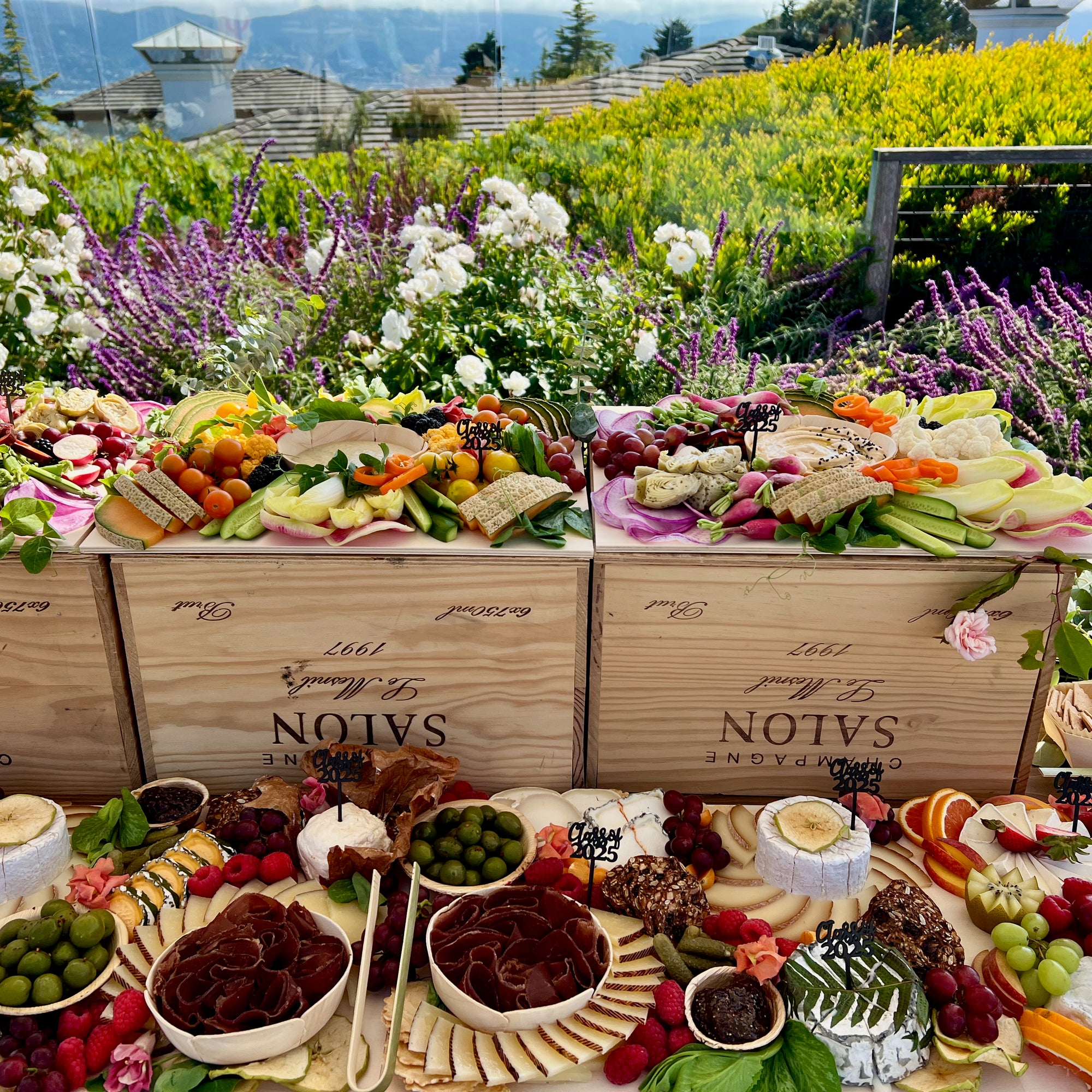 We design bespoke grazing tables that are as beautiful as they are delicious. Each custom spread is a feast for the senses — artfully arranged with fine cheeses, charcuterie, and seasonal accompaniments displayed on elegant crate risers for layered visual appeal. Lush greenery and fresh florals complete the scene, transforming any gathering into a stunning edible centerpiece that guests can’t stop admiring (or nibbling)!